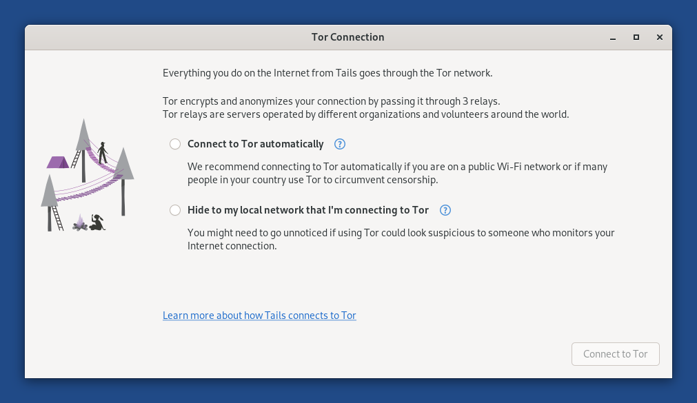 After you connect to a local network, the Tor Connection assistant appears to help you connect to the Tor network.