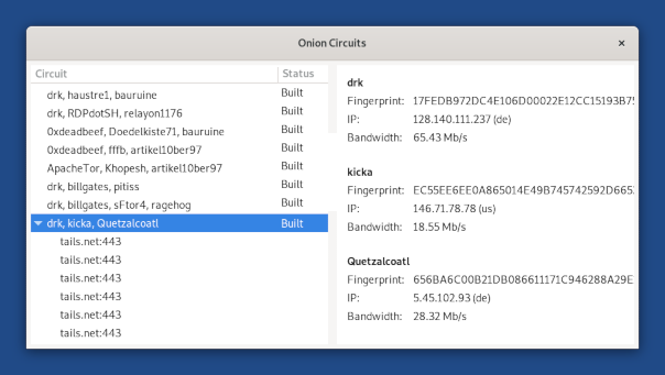 Ogni circuito Tor è composto da 3 relè Tor. Nell'esempio precedente, la connessione a tails.net passa attraverso i 3 relè drk, kicka e Quetzalcoatl.